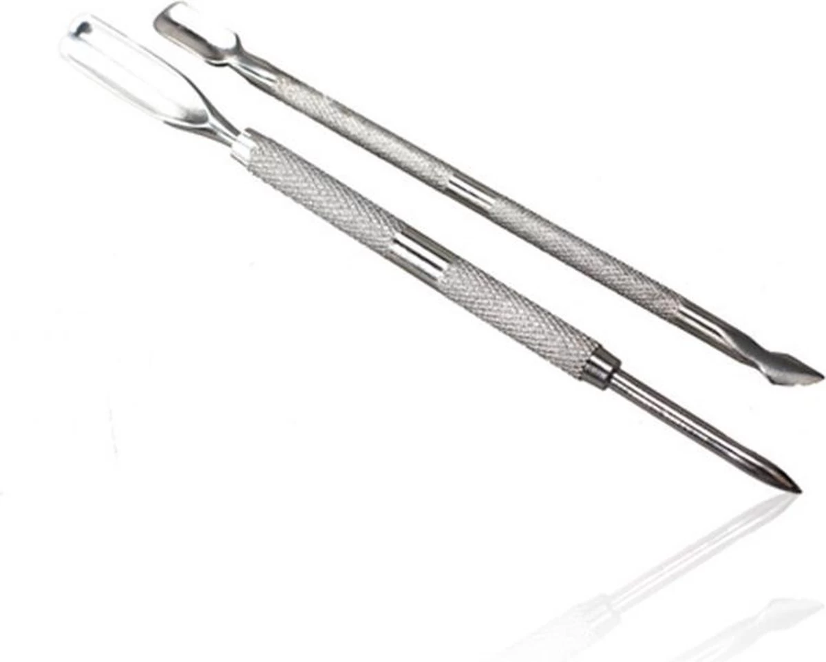 2x Bokkenpootje / cuticle pusher met aan de ene kant een scherpe punt en aan de andere kant een voetje in de vorm van een hoefje. Het voetje gebruikt u om de nagelriemen los te maken voordat u begint met het zetten van de kunstnagels. De scherpe punt van het bokkenpootje gebruikt u om de nagels schoon te maken of kunt u beide uiteinden voor de modelage van de gel of acryl gebruiken.