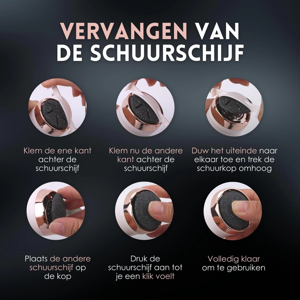 Dankzij het handige opzuigsysteem heb je geen last meer van rondvliegend eelt, maar wordt dit opgevangen in het reservoir, wat gemakkelijk af te spoelen is onder de kraan na gebruik. Met de verschillende schuurschijven (soft, medium, grof) is het geschikt voor grove en mindere grove plekken. Inclusief 4 meegeleverde schuurschijven én een gratis pedicure set voor een complete set!