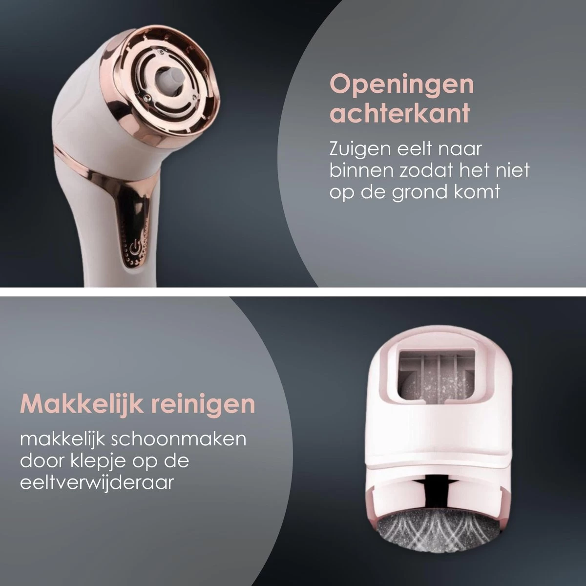Dankzij het innovatieve opzuig-systeem heb je geen last meer van rondvliegend eelt! Het eelt wordt namelijk achter de schuurschijf opgezogen en opgevangen in het reservoir. Na gebruik kun je gemakkelijk het klepje boven op het apparaat openen en afspoelen onder de kraan.